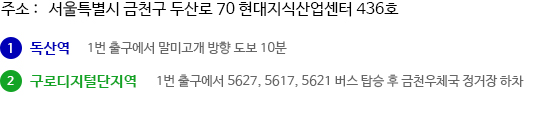 주소 : 서울특별시 금천구 두산로 70 현대지식산업센터 436호